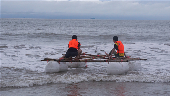隨后在教練的帶領(lǐng)下,小伙伴們扛著竹筏出海沖浪啦!坐在自己親手制作的“沖浪板”上迎接海浪的沖擊考驗(yàn),可以說是非常刺激了。