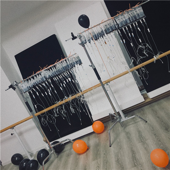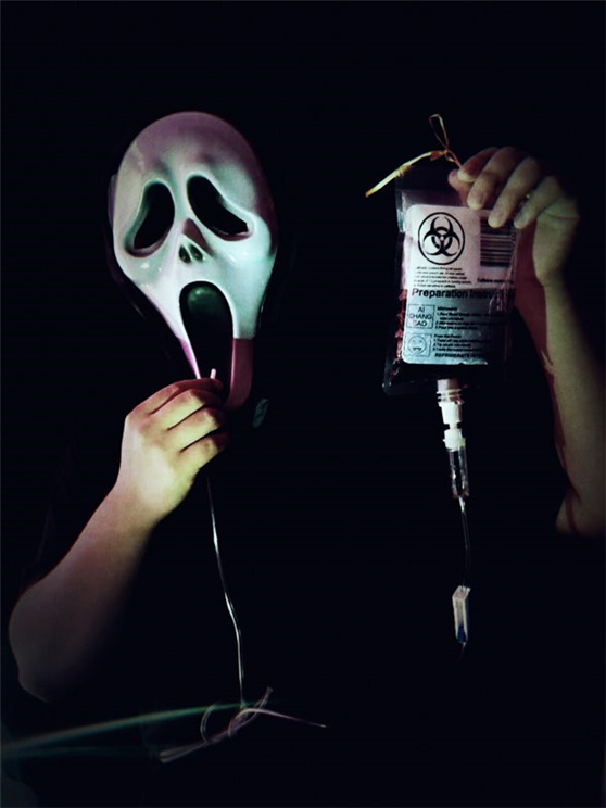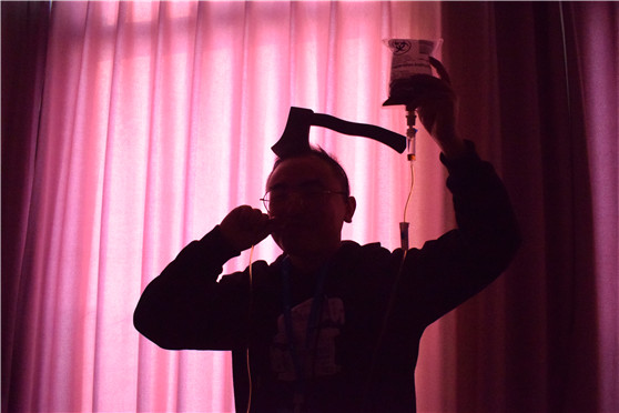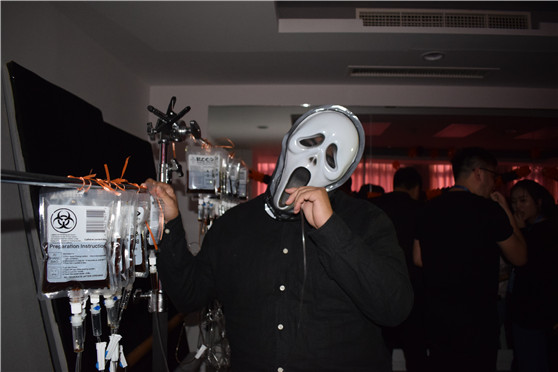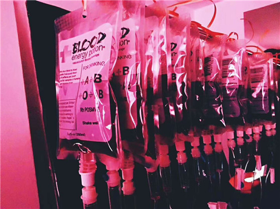 可怕的血漿你敢喝嗎 萬圣節(jié)當然少不了“血漿”飲料,一手拿著輸液袋一手拿著1.6米的超長輸液管喝血漿想想就毛骨悚然。戰(zhàn)刺激的事物是年輕人共同的愛好,恐怖的“血漿”飲料很快吸引了大家的眼光,好多小伙伴拿起了“血漿包”躍躍欲試。