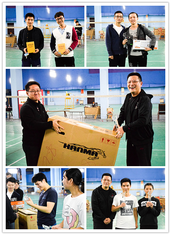 混雙的冠軍由市場部的虞雅萍和技術部的馬文廣奪得,亞軍是來自菲遇事業(yè)部的湯浚竹和門戶事業(yè)部的王平維;單打冠軍是甬潤企業(yè)管理顧問錢老師,亞軍是來自菲遇事業(yè)部的鄔宇博。混雙和男單的冠軍都將獲得價值八百塊的山地自行車一輛,亞軍的獎品是價值四百塊的鍵鼠套裝,三四名則獲得價值一百塊的購物卡。