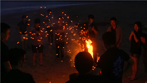 聽著海浪拍打沙灘的聲音,浪漫的篝火晚會(huì)點(diǎn)燃了大家的激情,但是天公不作美,篝火晚會(huì)過程中又下起了大雨,活動(dòng)不得不提前結(jié)束了。