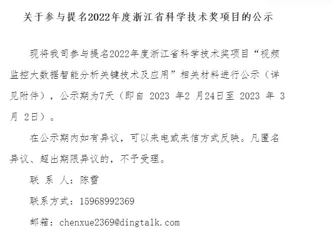 我司參與提名2022年寧波市科技進步獎項目《視頻監(jiān)控大數(shù)據(jù)智能分析關(guān)鍵技術(shù)及應(yīng)用》相關(guān)材料進行公示